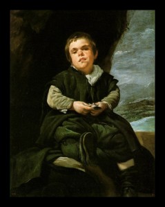 Для Веласкеса изображение шутов,карликов и людей находящихся на дне общества стало очень важной темой,из 50 картин Веласкеса в Музее Прадо,7 картин посвящены этому.Создавая портреты шутов и калек Диего Веласкес не унижает их,а наоборот показывает очень тонкую пространственную фикцию,выдумку,фантазию,как бы возвращает этих людей в нормальную жизнь,помещает их в серьезную рассудительную обстановку.