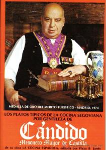 Меню Ресторана Месон де Кандидо включает блюда Кастильской кухни,традиционная кухня Центра Испании. Кроме фирменного блюда ресторана Месон де Кандидо,1/4 паросенка для 2-х персон ,в меню предлагаются горячие и холодные закуски, Кастильский суп 15 века SOPA CASTELLANA SIGLO XV, это тоже одно из фирменных блюд ресторана.Кроме этого вы можете заказать 13 мясных блюд на выбор, и 9 рыбных,типичная рыбная средиземноморская кухня. Подробнее вы можете посмотреть меню ресторана  Месон де Кандидо на испанском и английском языках на официальном сайте ресторана http://www.mesondecandido.es Очень интересный ритуал в ресторане с началом обеда или ужина,кто-то из владельцев читает притчу,она связана с историей Сеговьи, а затем разбивает тарелку об пол.