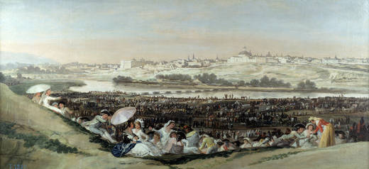 Это подготовительный рисунок для одного из эскизов декоративной серии, предназначенный для спальни инфанты в дворце Эль Пардо, изготовлении серии было прервано смертью Карла III в декабре 1788 года. Рисунок изображает один из самых любимых праздников мадриленьо, жителей Мадрида, Сан Исидро San Isidro , святого Исидора, покровителя Мадрида, на берегу реки Мансанарес в Мадриде. Фоном праздника стал сам Мадрид, окутанный тончайшим святящимся туманом. Среди зданий легко узнается Королевский Дворец, и собор Сан Франсиско эль Гранде, в то время главный кафедральный собор Мадрида.