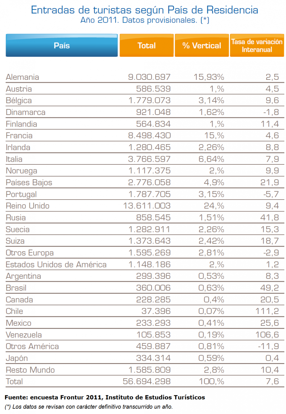 1-е место как всегда занимает Великобритания, по количеству туристов, 13.611.003 британцев посетило Испанию в 2011 году, это 24% процента рынка, за 2011 год рост составил +9.4%. На 2-м месте Германия, на 3-м Франция.