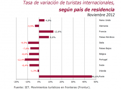 В ноябре 2012 года Испания получила рост туризма всего на +0.2% по сравнению с анологичным периодом прошлого года, согласно данным Frontur del IET, Института Статистики Испании. Как отмечают аналитики , это прежде всего связано с ухудшением экономической ситуации в Европе. Даже самая стабильная Германия , в ноябре 2012 года показала падение, в Испанию приехало на -3.5 % меньше немецких туристов, чем в ноябре 2011 года. В Испании самое большое падение показывают Канарские Острова, и это очень легко объснить, резкий рост в предудущие годы был связан с «революциями в Африке «, прежде всего в Египте и Тунисе. Но все основные туристические зоны Испании показывают рост Андалусия +4.9% , Валенсия +4.1% , Мадрид + 3.3% , Каталония +2.4% .