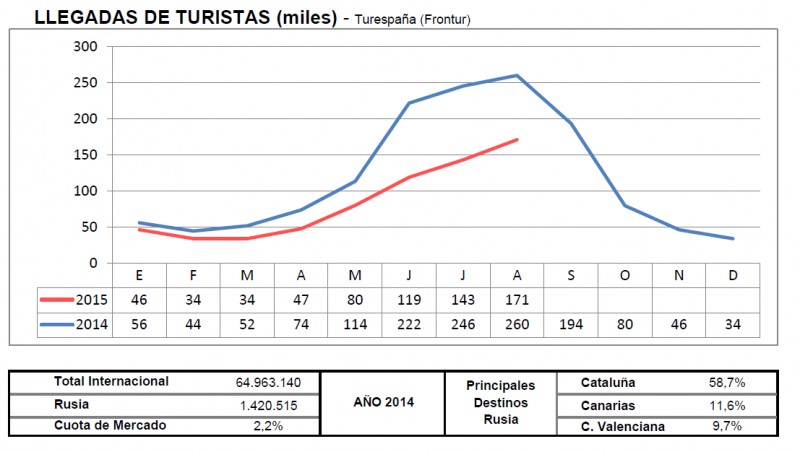 Согласно данным испанской государственной компании «Турэспанья (Тур Испания)Turespaña» пик российского туризма пришелся на 2013 год, Испанию посетили 1,58 млн. российских туристов , в следующем 2014 году количество российских туристов уменьшилось на 10%, до конца 2015 году ожидаемое падение составит 36,7%.