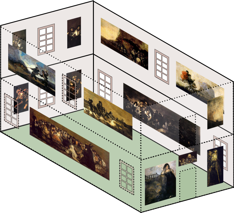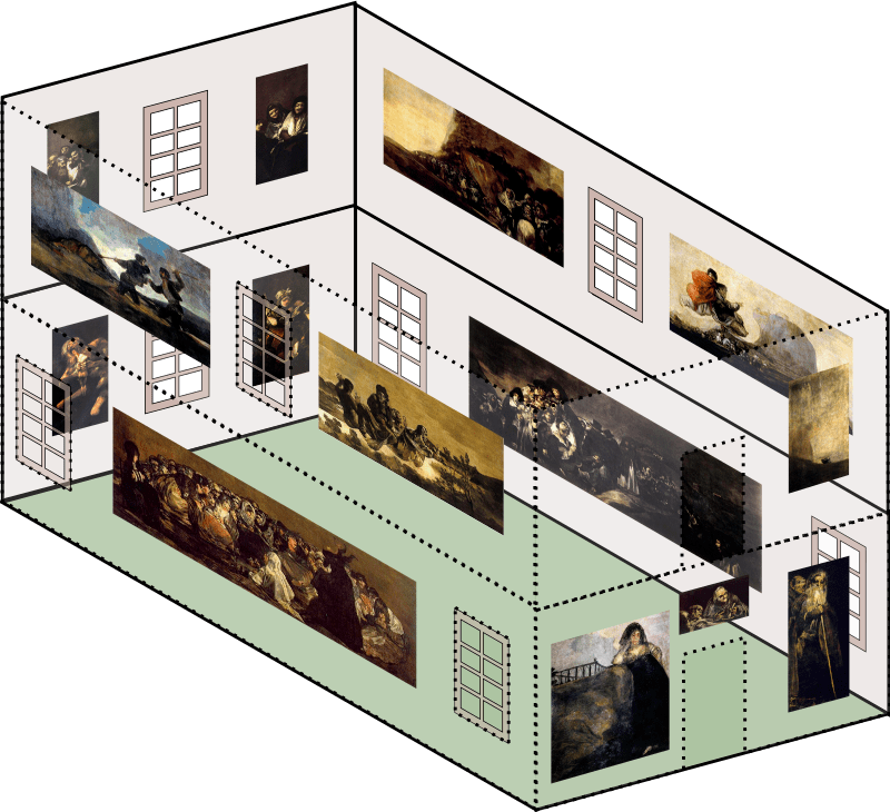 Но вернемся в «Дом Глухого Quinta del Sordo», и рассмотрим 14 полотен, черные картины , которые Франсиско Гойя написал на двух этажах.