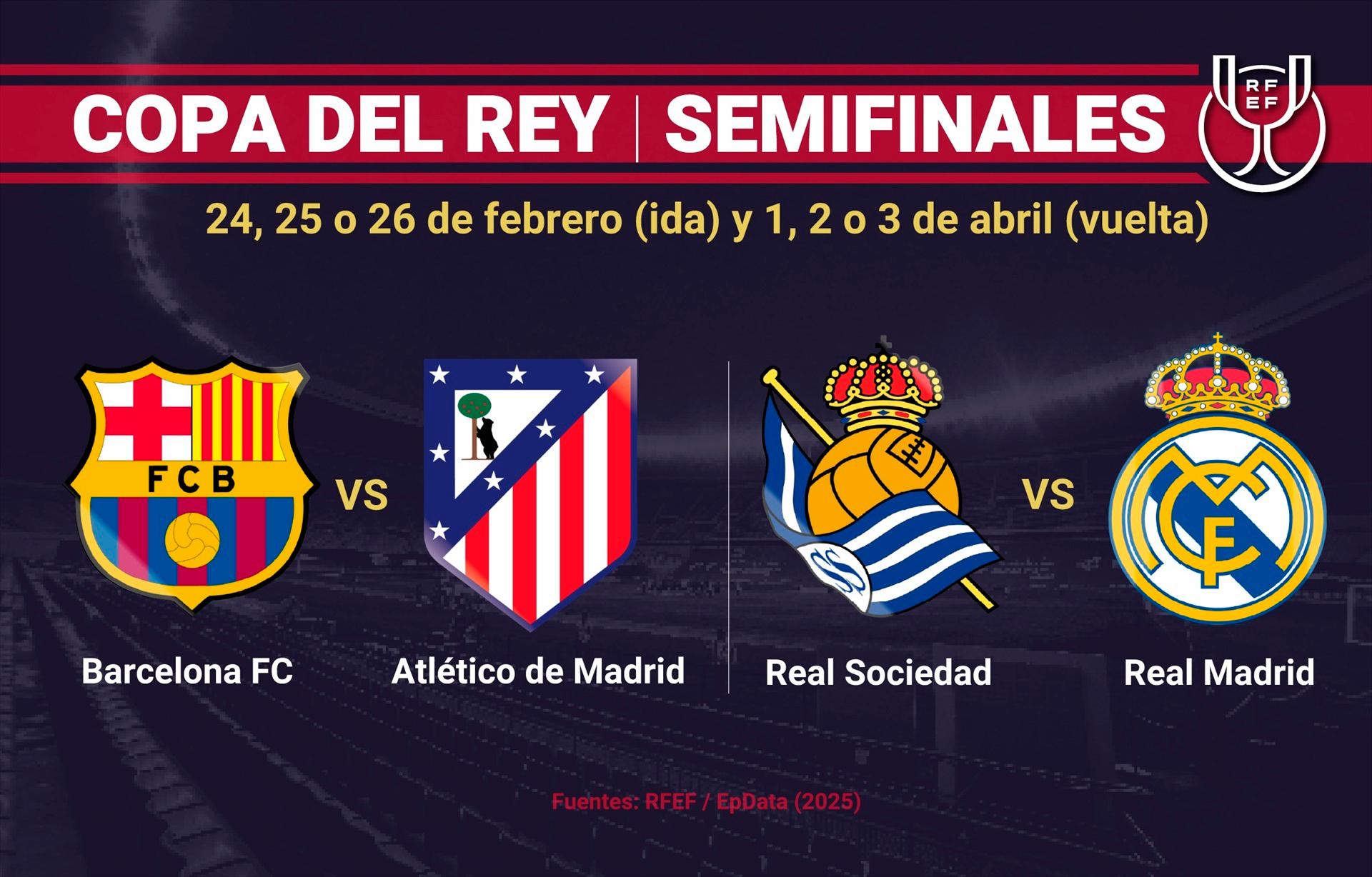 Ответные матчи полуфиналов Кубка Короля , Копа дель Рей, Copa del Rey сезона 2024-2025 годов состоятся в Мадриде, 1 и 2 апреля. Первые матчи, ФК Барселона — Атлетико Мадрид пройдет в Барселоне 25 февраля, Реал Сосьедад — Реал Мадрид , 26 февраля в Сан Себастьяне.